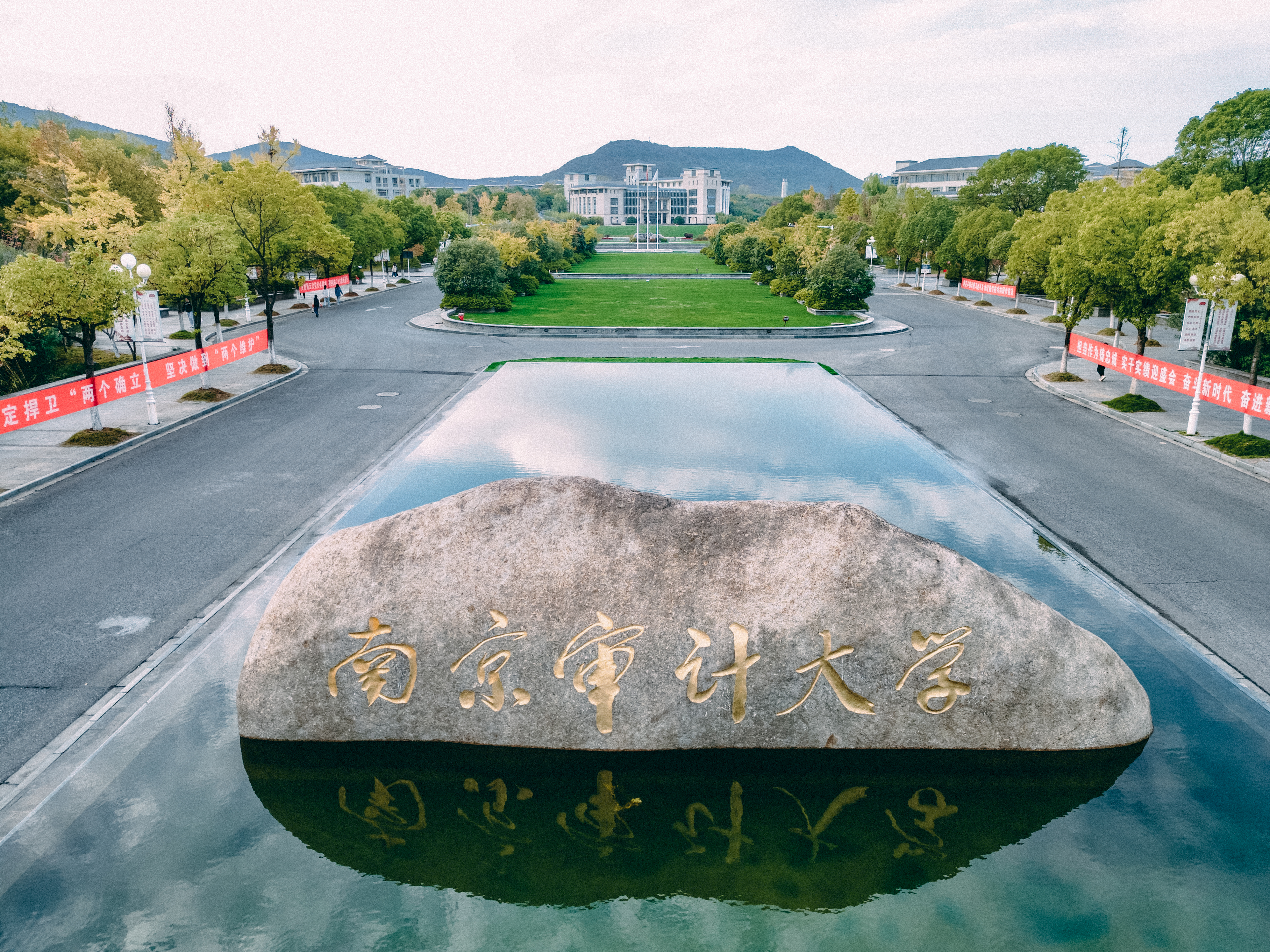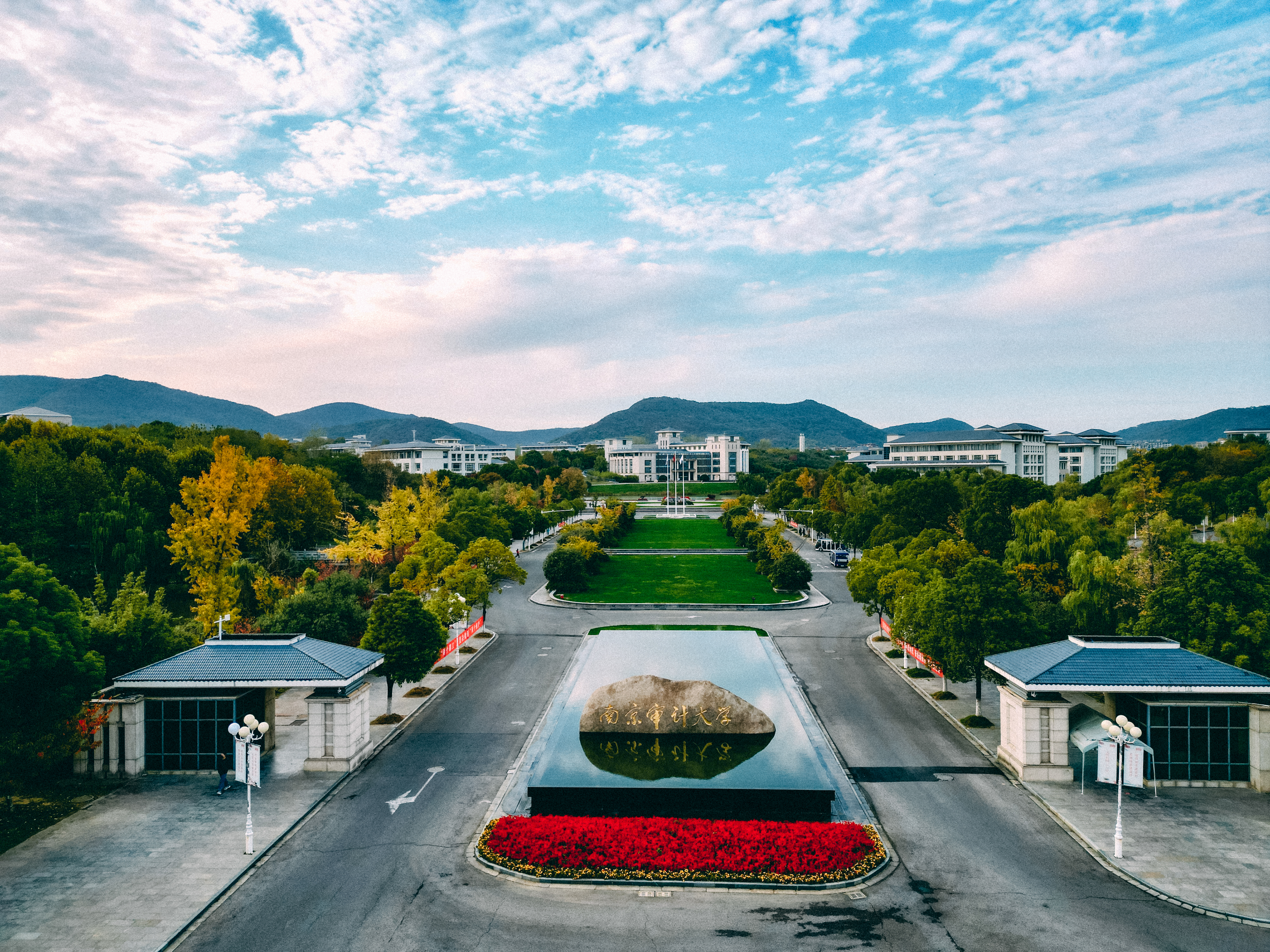 校园大门可概括为“门中门,门非门、非常门”,校名由第四任审计长,第十一届全国政协副主席,beat365中国官方网站名誉校长李金华亲笔题词,巨石勒名,未作雕饰寓意独立真实;其形势与背景老山十分契合。
