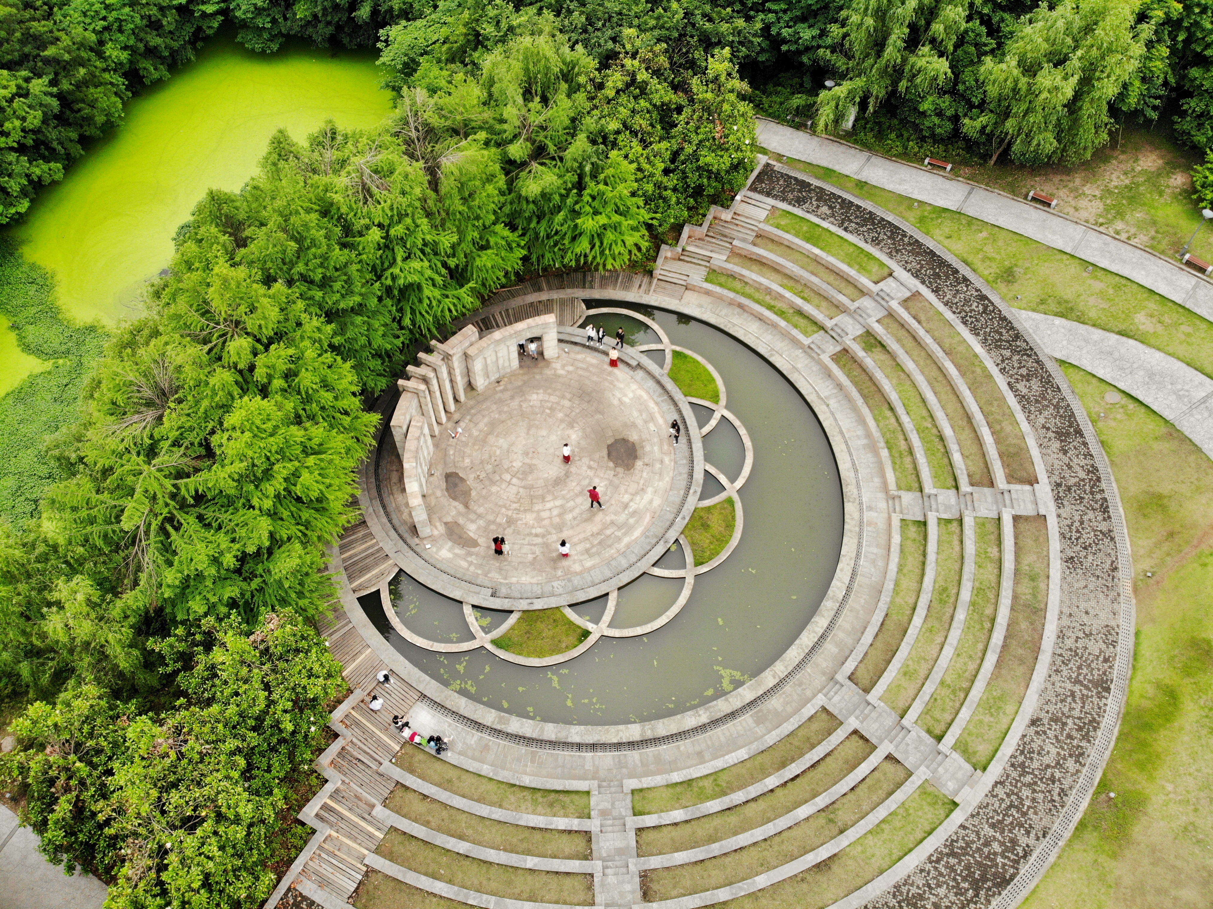水上音乐台依据原有山水形式而建,其舞台立于水中央,依山傍石,这潭水仿佛来自山涧溪流——清澈、纯洁、朝气勃发;看台环绕在山坡之上,以绿草为主体,着力营造出山水剧场并融于校内山水及校外山水的怀抱,体现出山水大舞台、舞台小山水大的景致,而学生则犹如满山的青春花草,向阳生长、在这里我们飞扬歌声、传递情感、表现生活,在这里我们拥有整个舞。