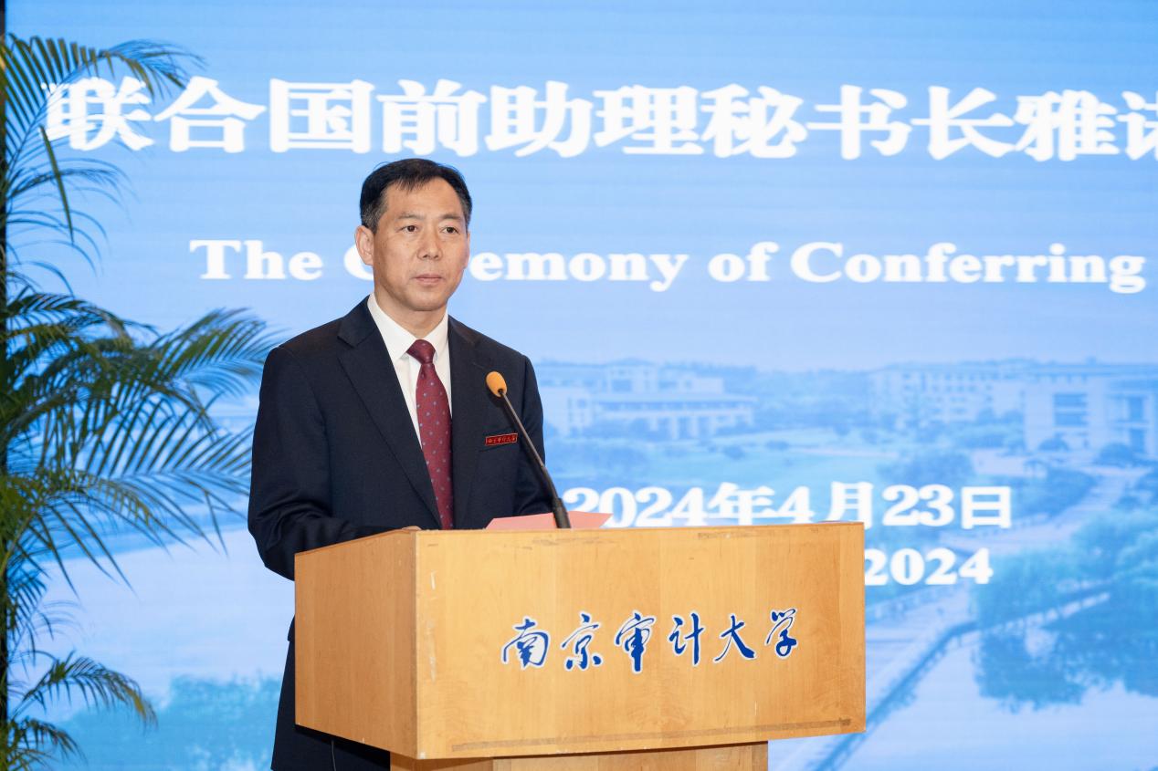 董必荣为联合国前助理秘书长雅诺什·帕兹托颁发荣誉教授聘书、佩戴校徽、赠送纪念品。