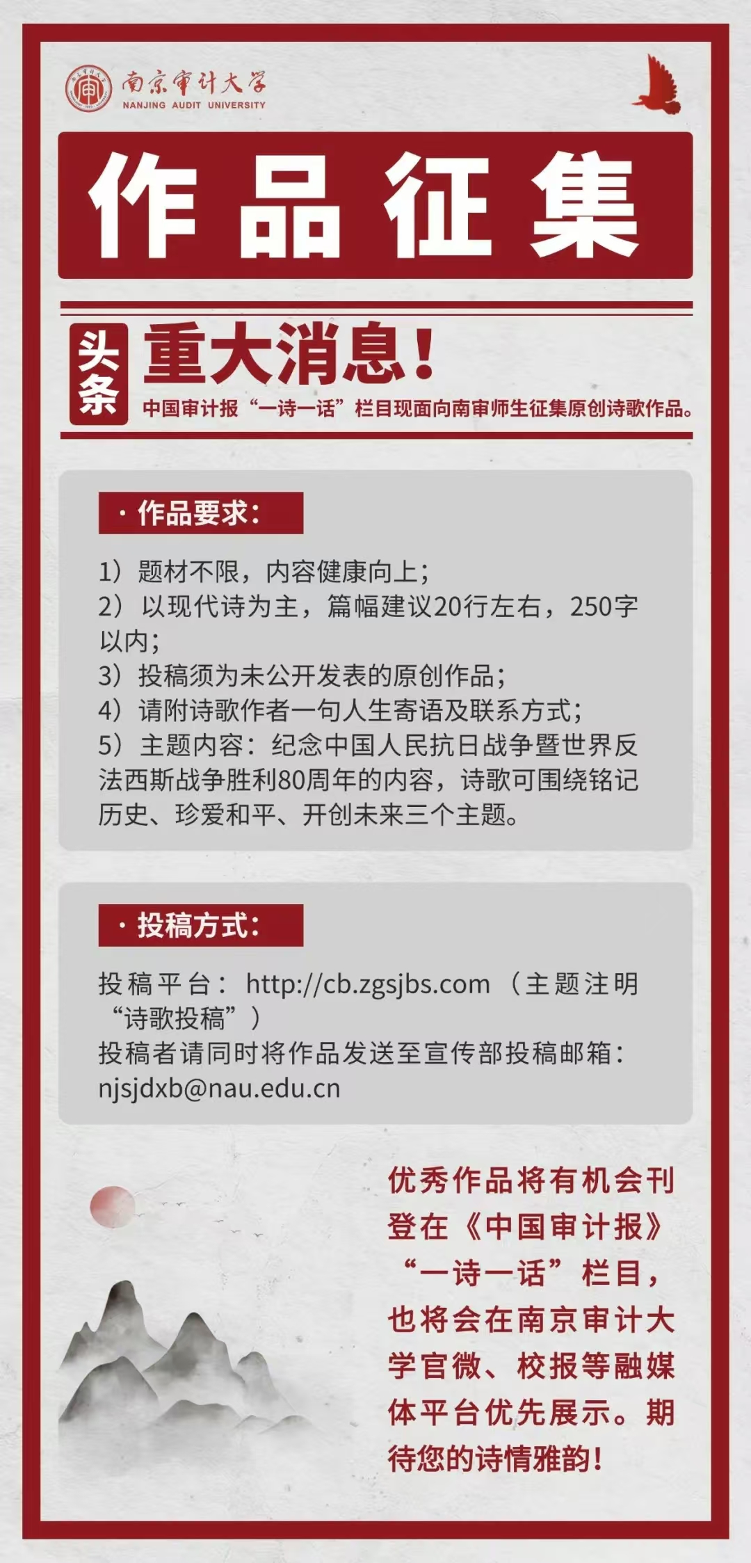 为纪念中国人民抗日战争暨世界反法西斯战争胜利80周年,中国审计报“一诗一话”栏目现面向南审师生征集原创诗歌作品~我们诚邀您围绕 “铭记历史、珍爱和平、开创未来” 三大主题,用诗行镌刻民族记忆,抒发时代心声!